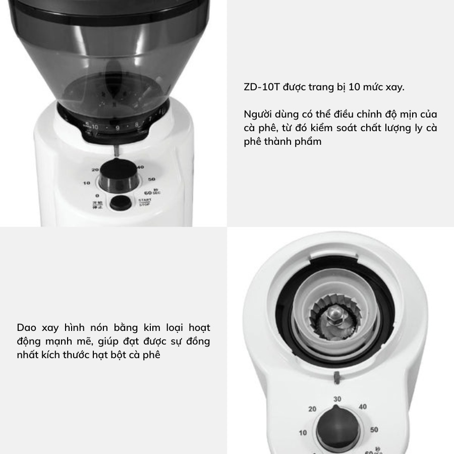Điểm khác biệt quan trọng nhất của ZD-10T so với bản ZD-10 thường nằm ở chữ “T” – tức là Timer (hẹn giờ). Máy cho phép cài đặt thời gian xay từ 0–60 giây, giúp người mới không cần đứng bấm giữ nút thủ công suốt quá trình xay. Bạn chỉ cần xoay núm chỉnh thời gian, bấm nút, máy sẽ tự xay và tự dừng khi hết thời gian đã cài.