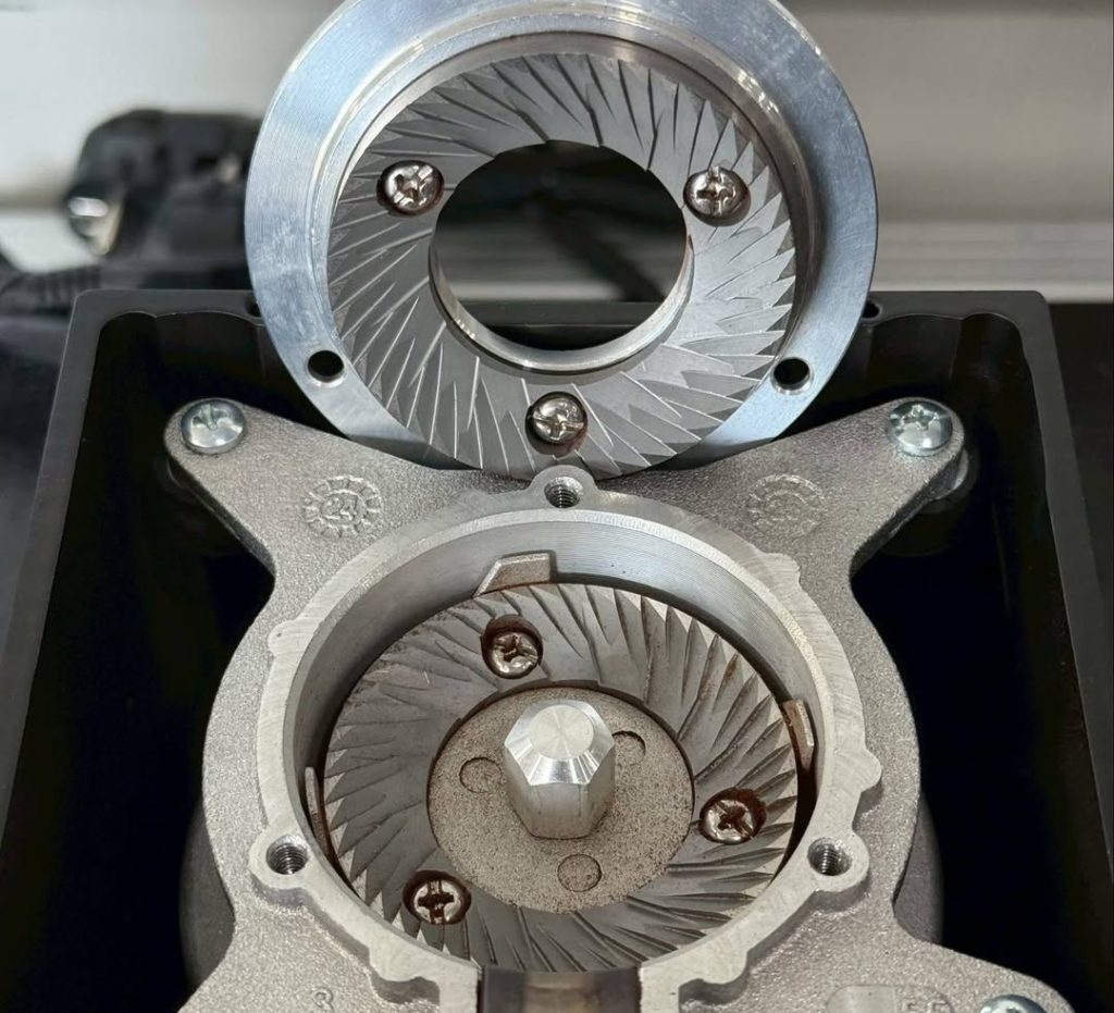 Hệ thống Blow Up Cleaning thổi sạch buồng xay theo đúng hướng khí thiết kế, chứ không phải kiểu “độ thủ công” như các máy gắn bellow ngoài. Trong thực tế, xay 15g cà phê thì bột trả về dao động quanh mức 14.9–15.1g – rất sạch so với tầm giá.